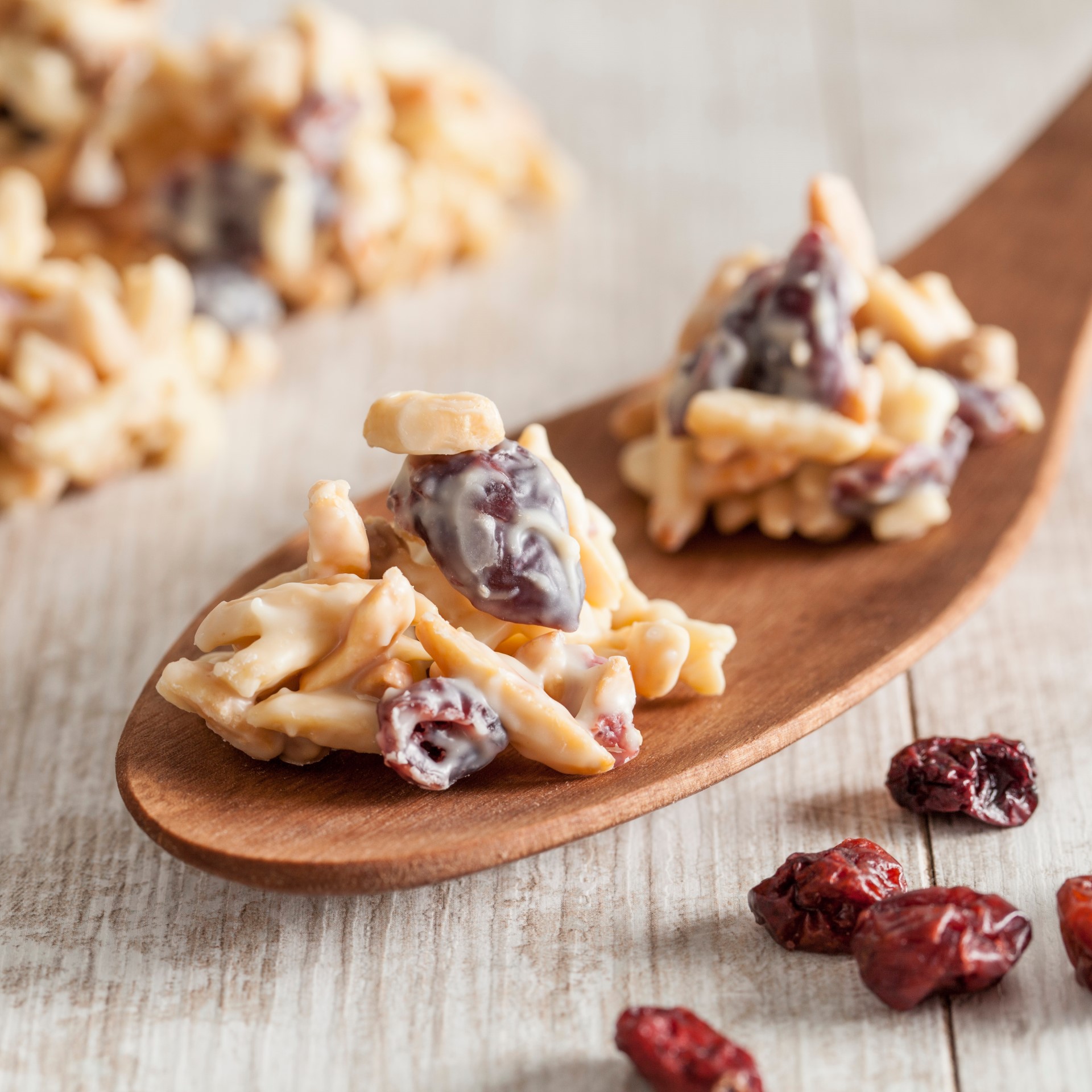 Zutaten: Mandeln, weiße Schokolade (Zucker, Kakaobutter, Vollmilchpulver, Emulgator: Sojalecithine, Vanilleextrakt), Sahne, Cranberrys, Crispybällchen (Backtriebmittel E500ii (Natron) Molke Pulver, Weizenmehl, Pflanzenfett.