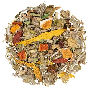 Zutaten: Griechische Bergkräuter, Lemongras, Fenchel, Orangenschalen, Eukalyptusblätter, Zitronenschalen, Nanaminze, Moringablätter, Gojibeeren, Sanddornbeeren, Sonnenblumenblüten